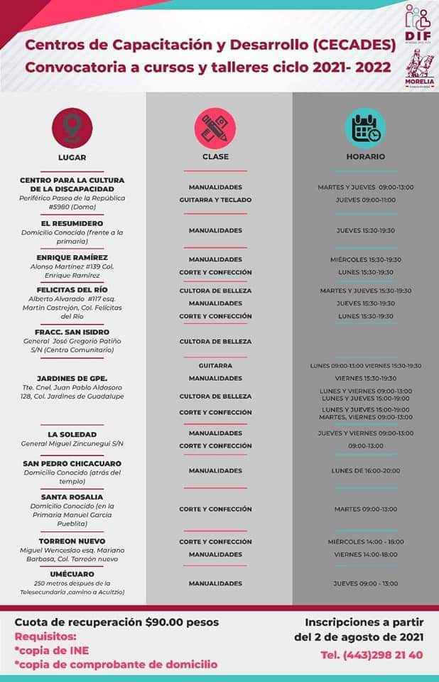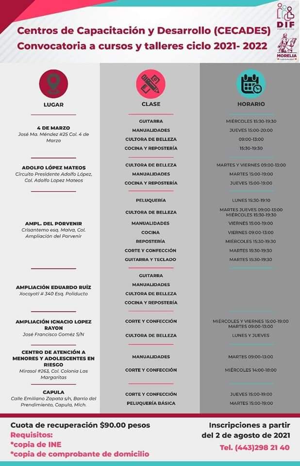 El Gobierno de Morelia, a través del Sistema DIF Municipal, convoca a jóvenes, mujeres y hombres a inscribirse a los cursos y talleres del ciclo 2021-2022 en los Centros de Capacitación y Desarrollo (Cecades) que se encuentran en las colonias y comunidades.