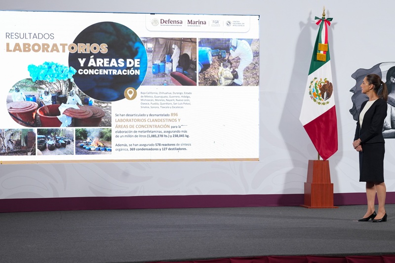 En 19 estados de la República: el Ejército y la Marina han destruido 896 laboratorios clandestinos y áreas de concentración para la elaboración de metanfetaminas; en estas acciones se han asegurado más de un millón de litros y más de 200 toneladas de sustancias químicas; una cifra sin precedentes, que representa una afectación económica a las organizaciones criminales de cientos de millones de pesos.