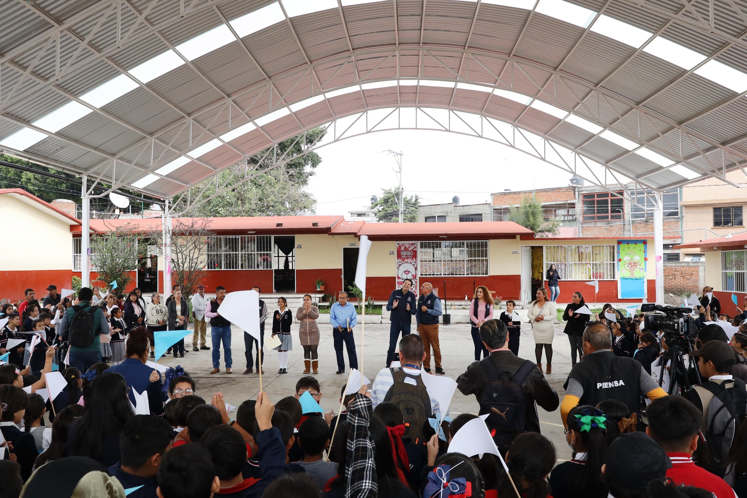 En un segundo punto, en la Unidad Deportiva Leandro Valle, inauguró una techumbre de la cancha multiusos, infraestructura de 500 metros cuadrados, 6 columnas, se colocó reja acero en tableros, iluminación, mantenimiento de pintura y electricidad a la unidad y cancha.