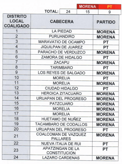 En lo que se refiere a las diputaciones locales, en 15 distritos encabezará Morena y en 9 el PT. Y como era de esperarse Morena encabezará la fórmula en el Distrito 02 Puruándiro, mientas que el Partido del Trabajo lo hará en los Distritos 08 de Tarímbaro y el 12 de Ciudad Hidalgo.