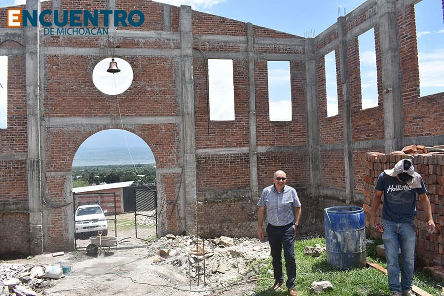 “El proyecto lo hizo el Ing. Fernando Tavera y también ha sido una pieza fundamental el Ing. Ramón Martínez, de aquí de Huandacareo, que ha dirigido la obra con los muchachos que están construyendo la capilla”, explica el párroco en el interior de la capilla, donde algunos albañiles siguen con su labores.