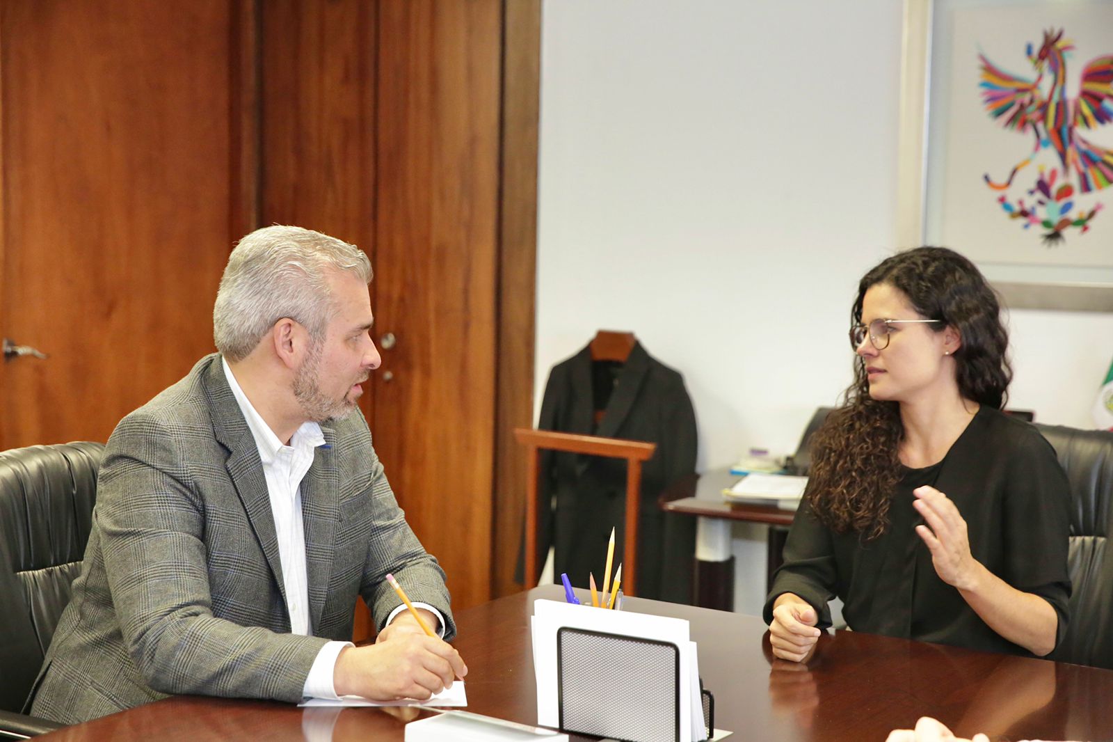 El gobernador Alfredo Ramírez Bedolla se reunió con Luisa María Alcalde Luján, secretaria del Trabajo y Previsión Social (STPS) del Gobierno de México para avanzar con el proceso de regularización de los derechos laborales de los trabajadores de la industria aguacatera.