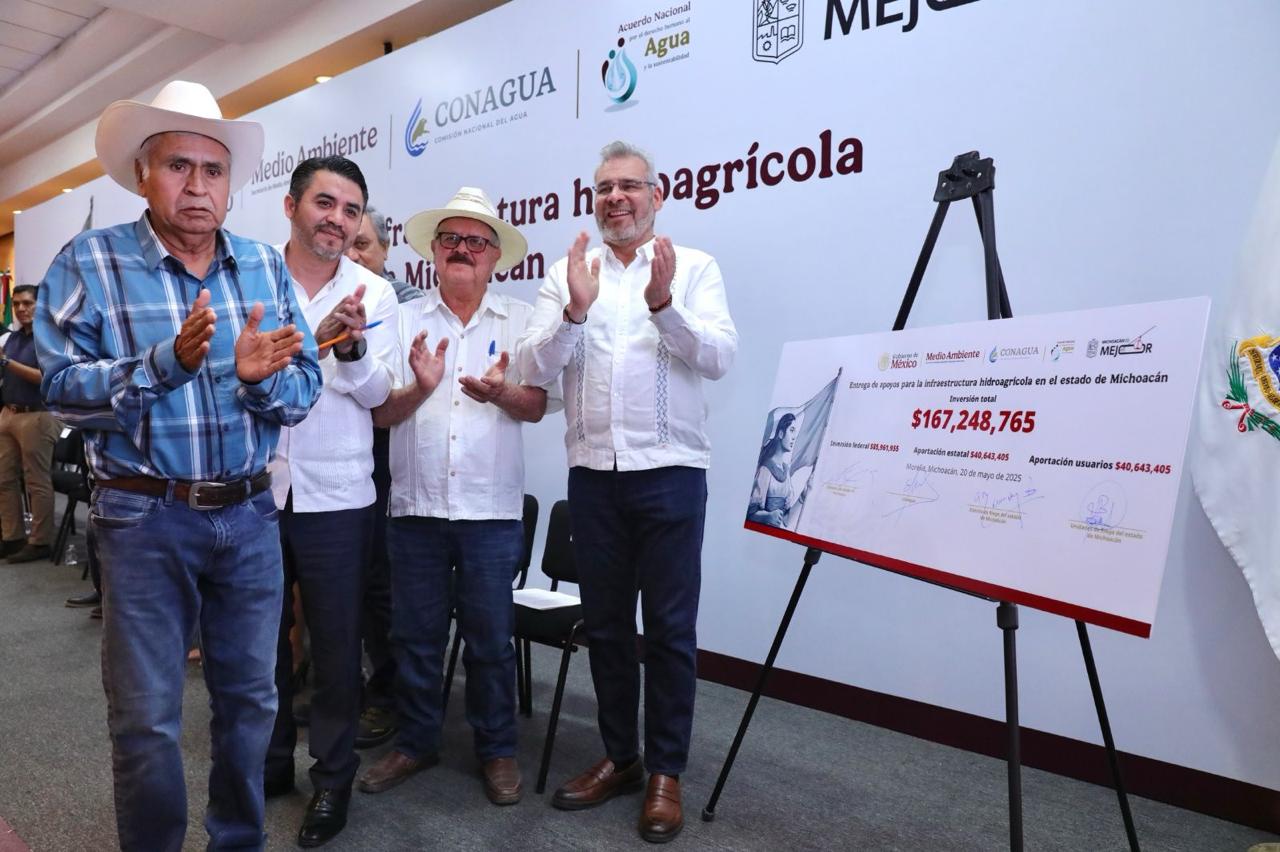 El gobernador Alfredo Ramírez Bedolla y el director general de la Comisión Nacional del Agua (Conagua), Efraín Morales López entregaron apoyos por 170 millones de pesos para mejorar la infraestructura hidroagrícola de Michoacán, en beneficio de más de 2 mil 500 hectáreas de cultivos.