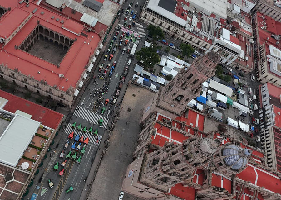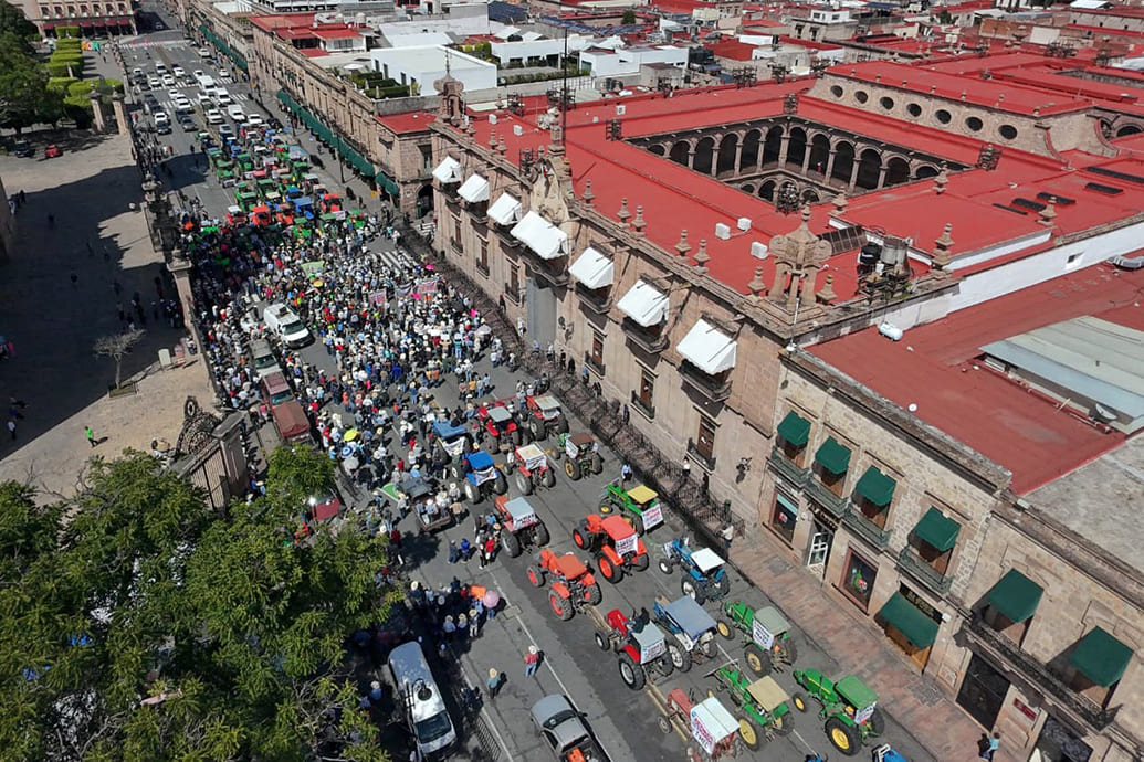 Productores de Michoacán bloquean el Centro Histórico de Morelia con sus tractores, al sumarse al Paro Nacional por la Defensa del Campo que exige un pago mínimo de 7,200 pesos por tonelada y la exclusión de los granos en el T-MEC
