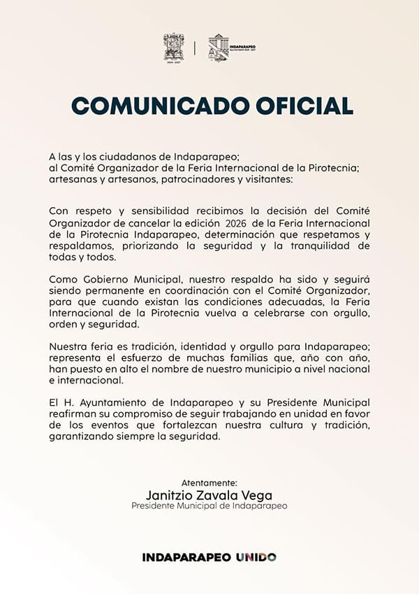 “Con respeto y sensibilidad recibimos la decisión del Comité Organizador de cancelar la edición 2026, determinación que respetamos y respaldamos, priorizando la seguridad y la tranquilidad de todas y todos”, declaró el alcalde de Indaparapeo.