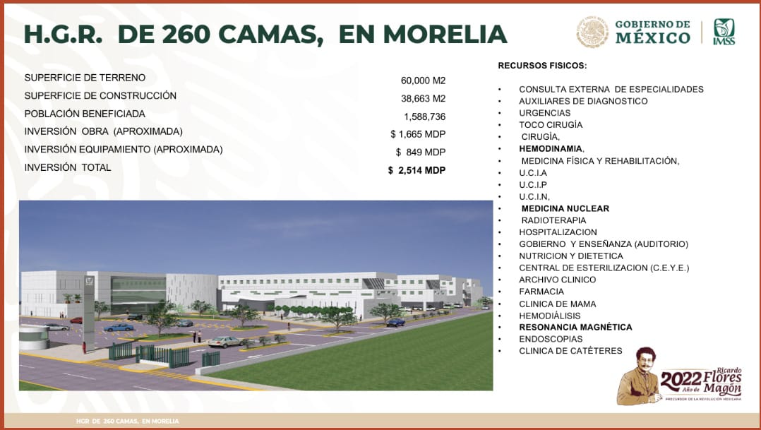 El nuevo hospital contará con 36 especialidades, 260 camas y, además de garantizar la atención y cuidado de la salud de los derechohabientes de Morelia y diversos municipios, será una fuente de empleo para 2 mil 500 personas, entre personal médico y administrativo.