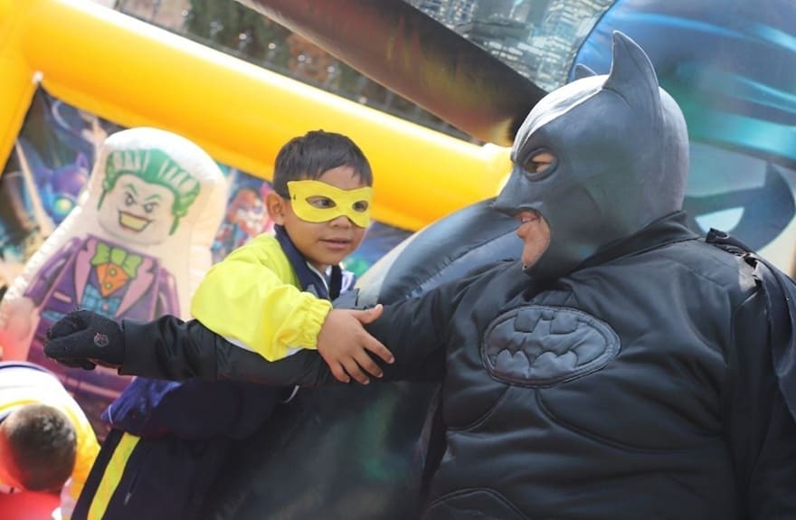 Funcionarios caracterizados como héroes, antifaces para las niñas y niños, pintacaritas, inflables, talleres de coloreado, snacks, aguinaldos, juegos, regalos y la participación del payaso Chocolatín, formaron parte de esta fiesta llena de color y entusiasmo que alegró a las familias asistentes.