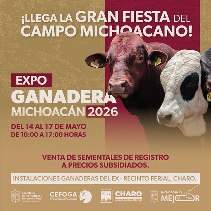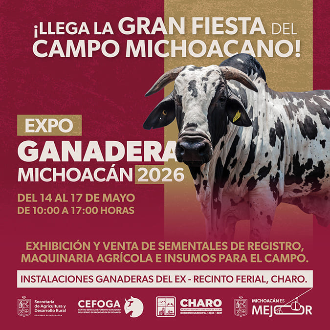Con venta de sementales de registro a precios subsidiados, además de una amplia exposición de maquinaria y equipo agropecuario, semillas, fertilizantes, artesanías, gastronomía y productores mezcaleros de la región, el Gobierno Municipal de Charo está listo para recibir a ganaderos de todo Michoacán en la Expo Ganadera Michoacán 2026, en las instalaciones del recinto ferial del 14 al 17 de mayo.