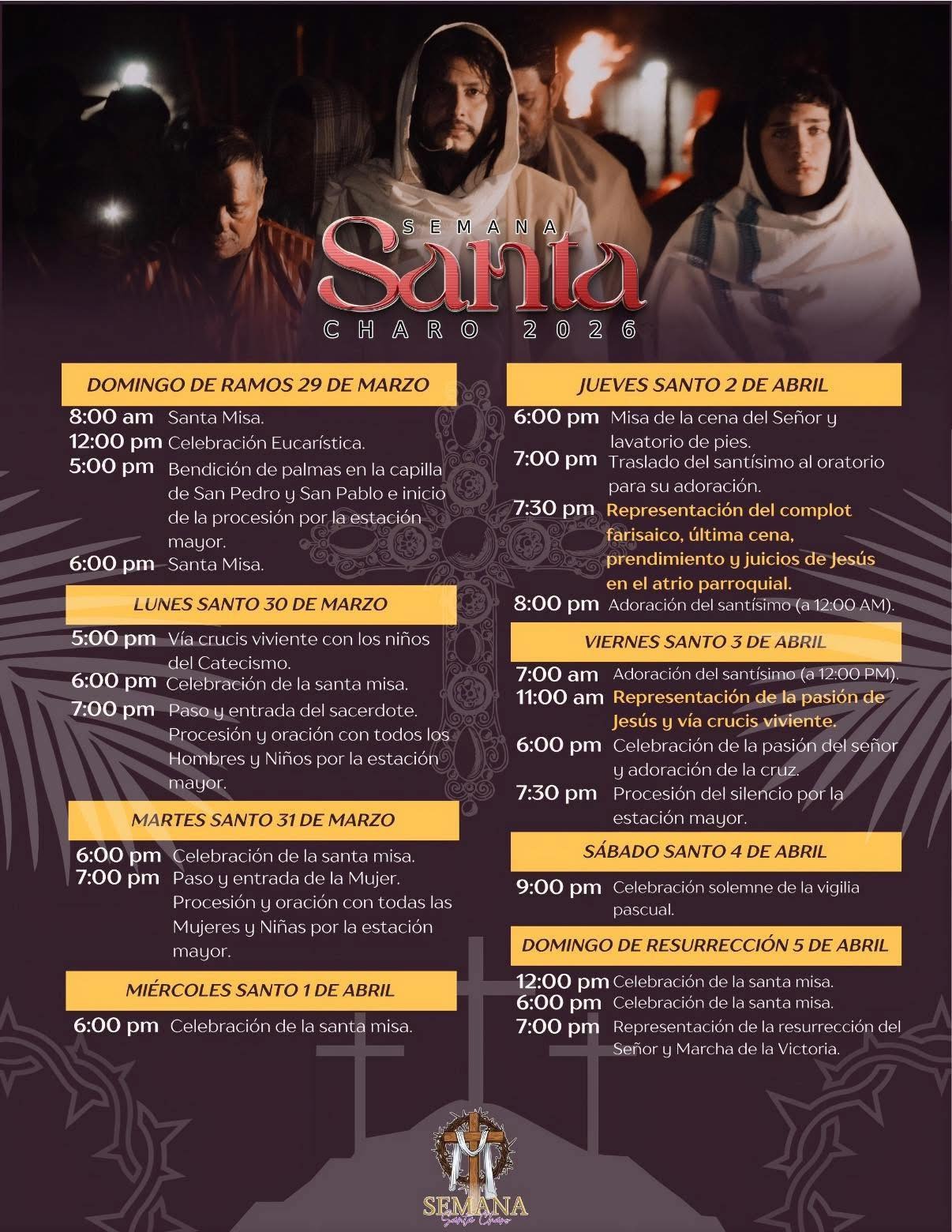 El Viernes Santo será el día central, donde los 150 participantes, tras meses de preparación física y espiritual, darán vida al Vía Crucis Viviente. “La entrega de nuestros actores es lo que hace que Charo sea un destino especial en estas fechas; la gente viene a vivir la pasión con nosotros”, destacó Rubén Hernández.
