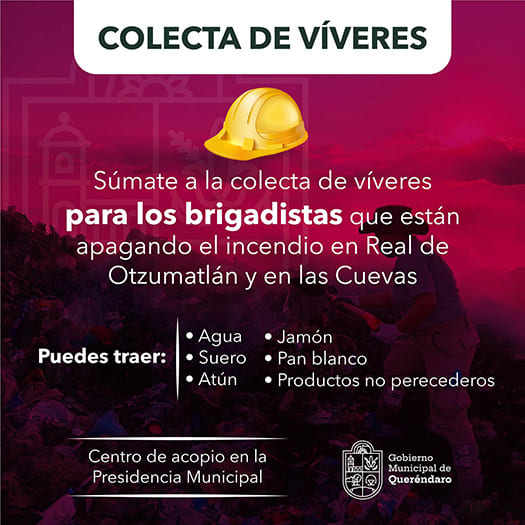 Mientras los valientes brigadistas luchan contra el incendio en Real de Otzumatlán y San Miguel Las Cuevas, el gobierno municipal de Queréndaro exhortó a la población a sumarse en la colecta de víveres para los brigadistas forestales, a quienes los habitantes pueden apoyar con agua, suero, atún, jamón, pan blanco y demás productos no perecederos, considerando lo que los propios brigadistas han señalado, que “una vez que entramos a combatir el fuego a los cerros, es difícil para nosotros bajar a las comunidades por alimentos, así que comemos y nos hidratamos en la misma zona de combate al fuego”.