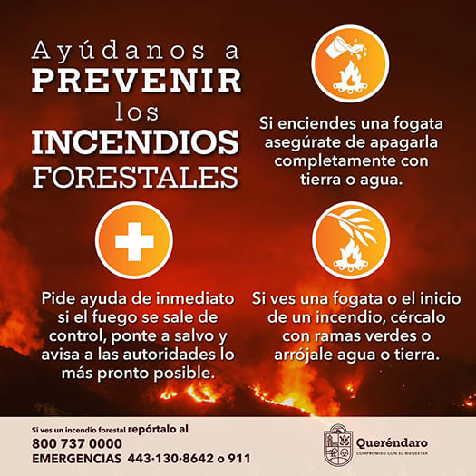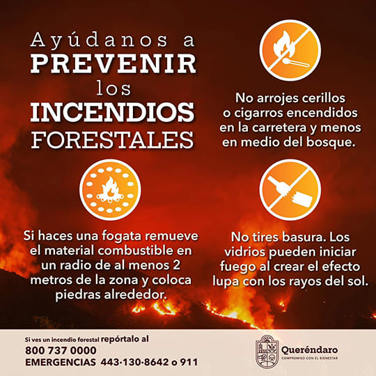 Además el gobierno municipal que encabeza Diana Caballero exhortó a la población a prevenir los incendios, con las siguientes recomendaciones: no arrojar cerillos o cigarros encendidos al bosque; si haces fogata, apágala con agua o tierra y remueve el material combustible en un radio de dos metros; no arrojar basura y menos vidrios, que pueden iniciar el fuego; si ves un incendio, repórtalo de inmediato y ponte a salvo.