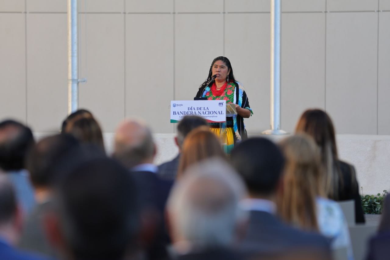 En el marco de la ceremonia cívica por el Día de la Bandera, la oradora oficial, Alicia Mateo Manzo, llamó a las y los morelianos a construir un mejor futuro juntos, sin olvidar la memoria de los pueblos originarios.