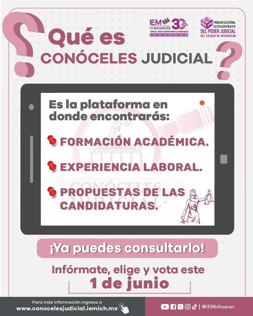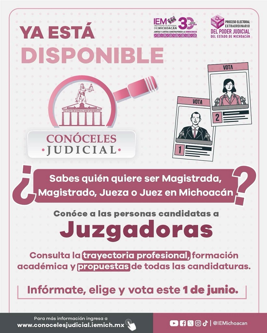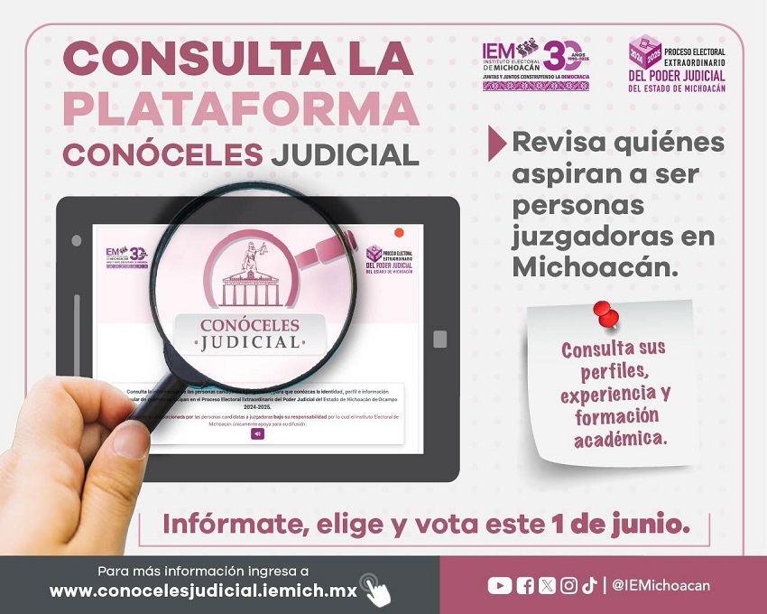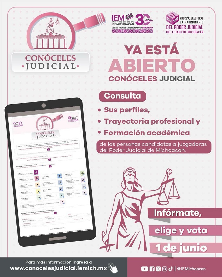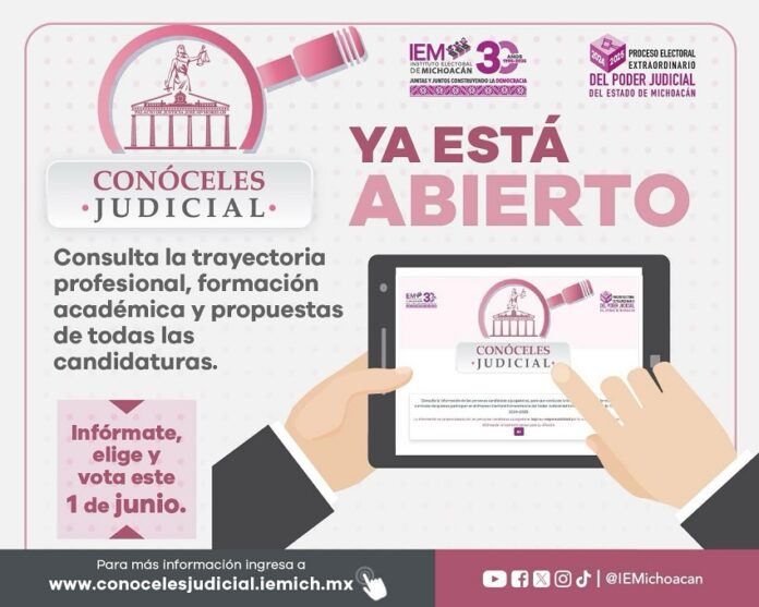 Con el objetivo de garantizar el derecho de la ciudadanía a emitir un voto informado, el Instituto Electoral de Michoacán (IEM) habilitó el sistema “Conóceles Judicial”, una plataforma digital donde se puede consultar la trayectoria profesional y académica de las personas candidatas a integrar el Poder Judicial del Estado.