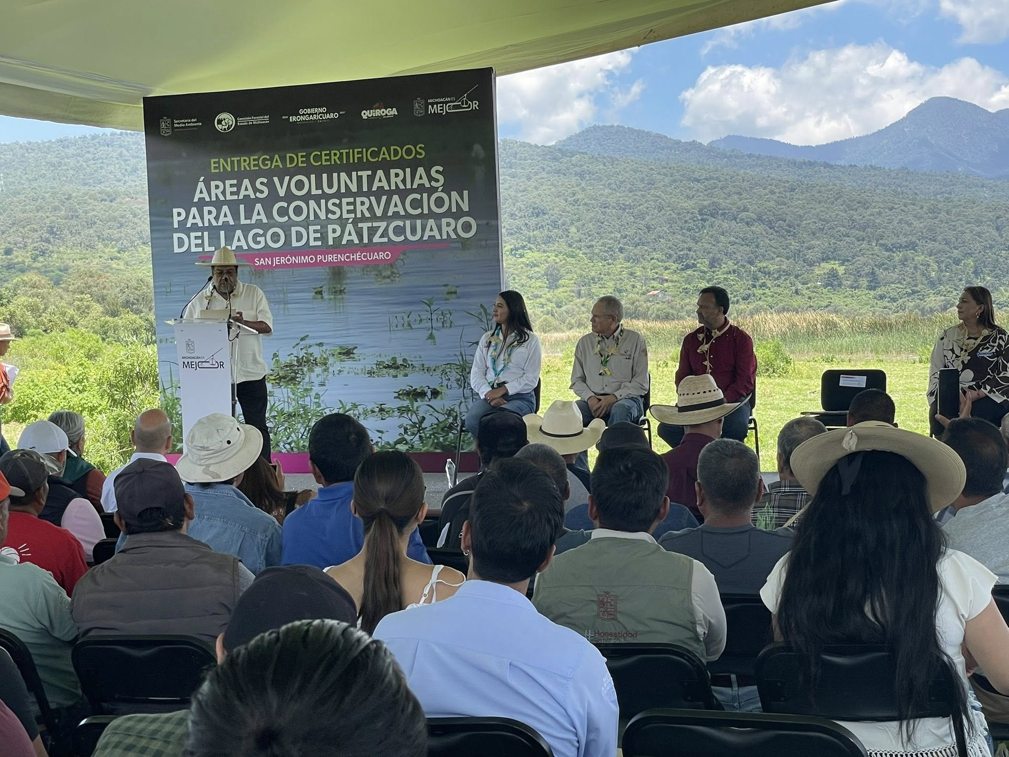 “Es un esfuerzo colectivo”, manifestó el gobernador, al subrayar el interés de las comunidades para sumarse a esta política ambiental. Ejemplo de ello es la entrega de certificados de Áreas Voluntarias para la Conservación del corredor biocultural de la zona norte del lago de Pátzcuaro a las comunidades de Santa Fe de la Laguna, San Andrés Tziróndaro, Oponguio, Napízaro y San Jerónimo Purenchécuaro, que protegerán cerca de 8 mil 200 hectáreas de bosque.