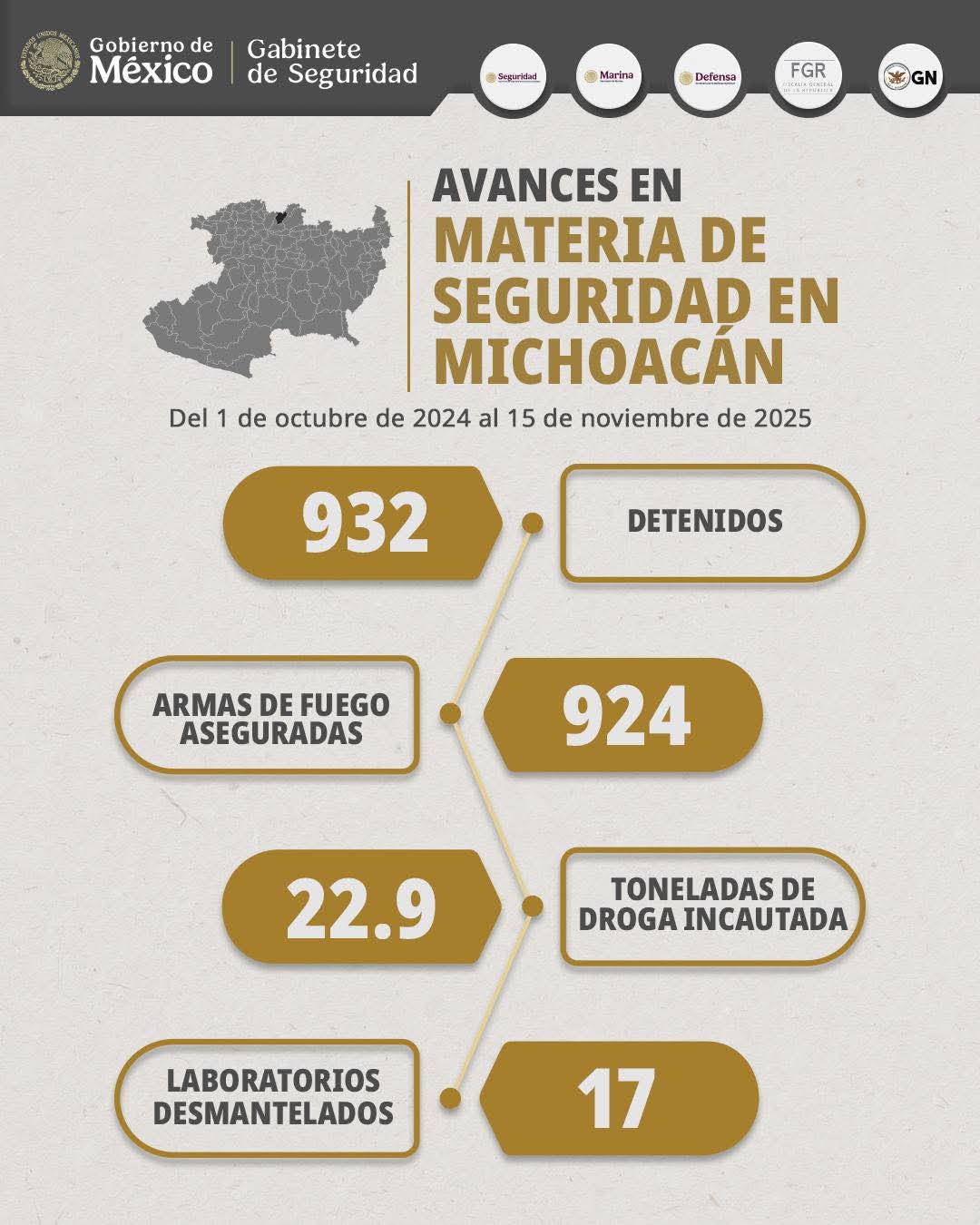 Desde el inicio de la administración y con un impulso especial a partir del Plan Michoacán presentado por la Presidenta de México, las cifras reflejan la presión ejercida sobre los grupos criminales: