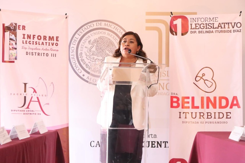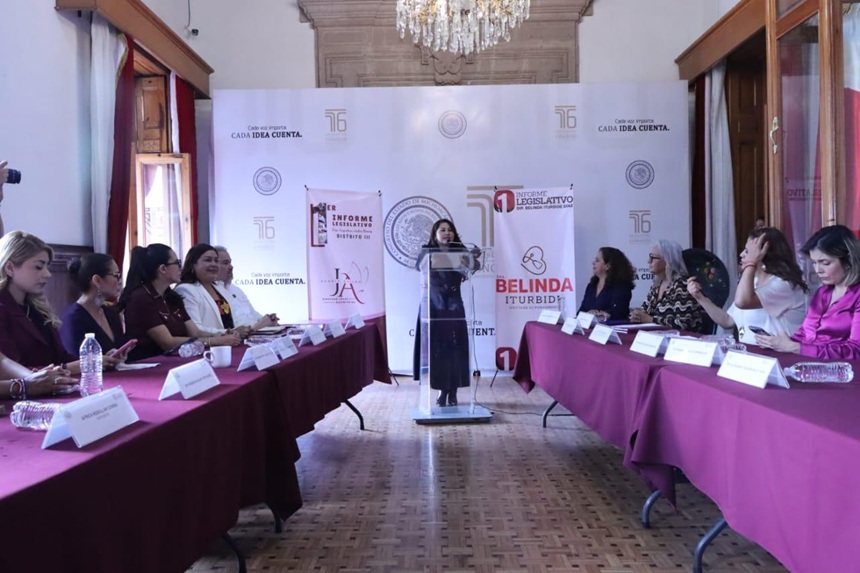 Acompañada por la Presidenta de la Mesa Directiva, Giulianna Bugarini Torres, la Presidenta de la JUCOPO, Fabiola Alanís Sámano, así como de las y los integrantes del grupo parlamentario de MORENA, Belinda Iturbide informó que durante el primer año de gestión, presentó 33 iniciativas de ley, de las que 4 ya son ley, especialmente en materia de salud y educación.