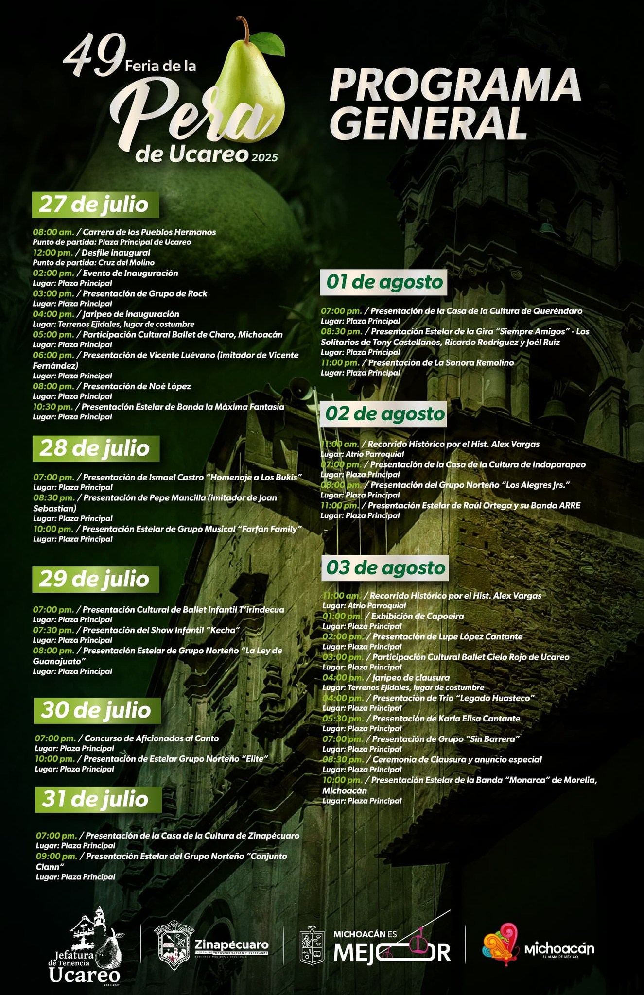 La 49.ª Feria de la Pera de Ucareo se prepara para abrir sus puertas del 27 de julio al 3 de agosto, prometiendo una semana llena de actividades culturales, gastronómicas, deportivas y sorpresas que impulsarán la economía local y el turismo en esta comunidad de origen Mazahua. La información detallada sobre el evento fue compartida en una conferencia de prensa realizada en la Casa de las Artesanías de Michoacán.