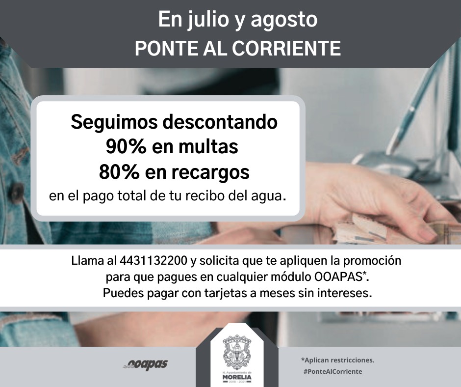 El Organismo Operador de Agua Potable, Alcantarillado y Saneamiento de Morelia (OOAPAS) contará con dos programas de descuentos durante los meses de julio y agosto: uno es el programa “Ya lo pasado, pasado… dile adiós a tu deuda del agua”, que ofrece descuentos en adeudos de 60 meses o más, con la finalidad de que los usuarios con gran rezago puedan ponerse al corriente; el otro es el programa “Ponte al Corriente”, el cual seguirá vigente con descuentos en multas y recargos a los usuarios que paguen la totalidad de sus adeudos de agua.