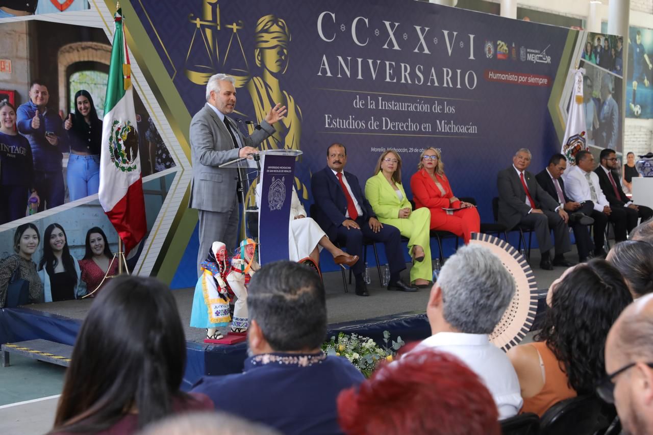 Durante la conmemoración del 226 Aniversario de la Instauración de los Estudios de Derecho, en la Facultad de leyes de la Universidad michoacana de San Nicolas de Hidalgo (UMSNH), el mandatario destacó el poder del derecho para transformar la realidad social, como ocurrió con la modificación de las leyes de las constituciones federal y estatal para salir a las urnas el próximo 1 de junio y elegir al Poder Judicial.