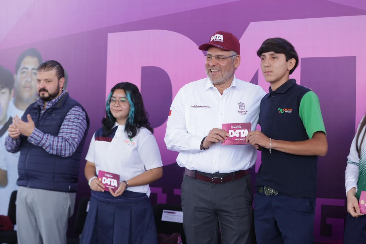 El gobernador Alfredo Ramírez Bedolla entregó chips de internet y tarjetas SIM del Programa D4TA, Datos Gratis, a cerca de 500 jóvenes del Colegio de Estudios Científicos y Tecnológicos de Michoacán (Cecytem), plantel Uruapan, para que puedan continuar su educación sin interrupciones.