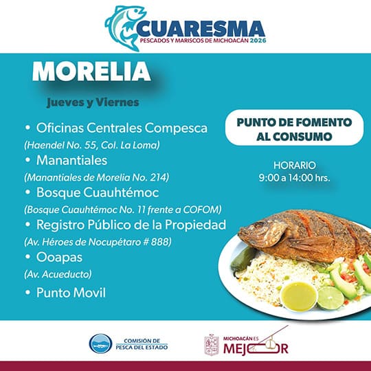 Este año, como es ya una costumbre, para facilitar el acceso de las familias michoacanas al consumo de pescados y mariscos en esta Cuaresma, se han establecido puntos de venta estratégicos tanto en la capital michoacana como en el interior del estado.