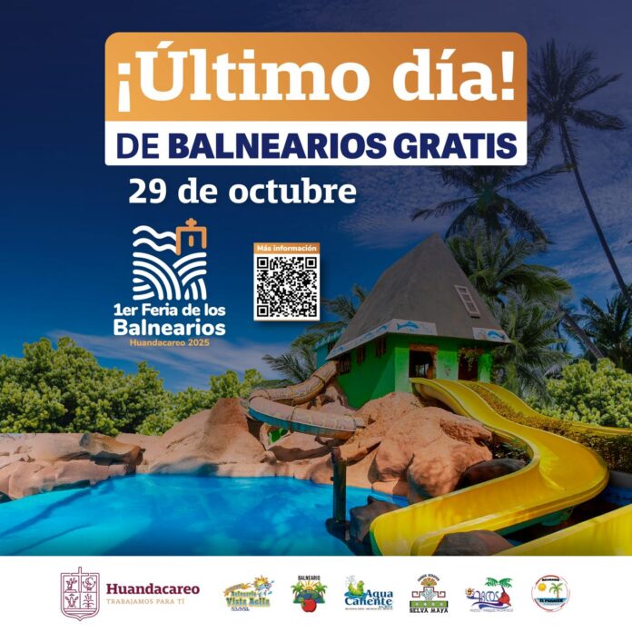 Alexis Velázquez, presidente municipal de Huandacareo, invita a todas y todos a disfrutar del último día de la 1ª Feria de los Balnearios, que se llevará a cabo este miércoles 29 de octubre, donde las y los asistentes podrán ingresar de manera gratuita a los seis parques acuáticos del municipio.