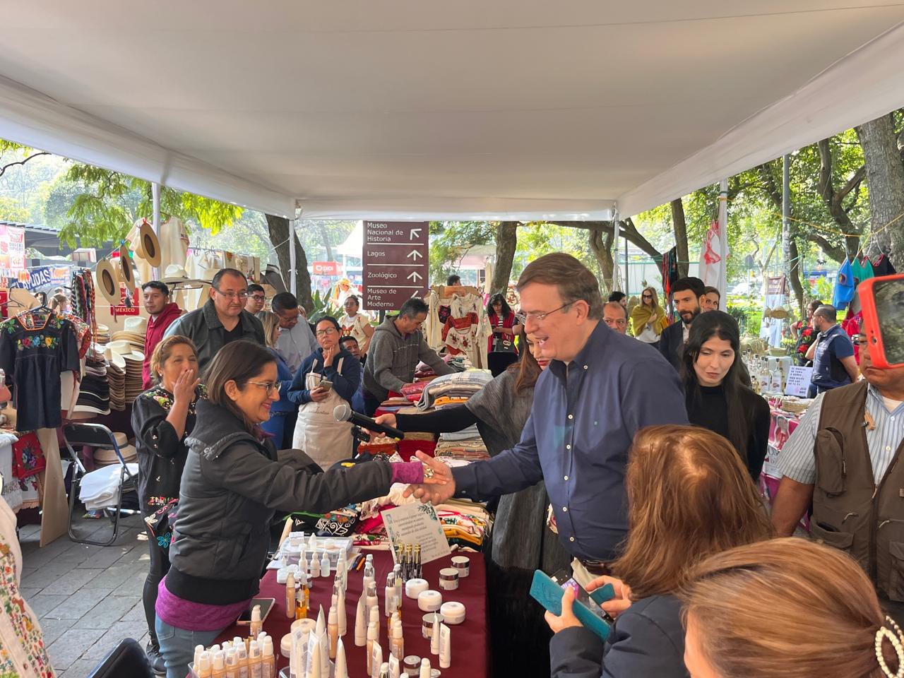 El Secretario de Economía del Gobierno de México, Marcelo Ebrard, encabezó la Feria de Comercio por la Paz y la Justicia, un evento que reunió a más de 150 expositores provenientes de todas las regiones de Michoacán, con el propósito de reactivar la actividad económica y fortalecer los ingresos de artesanas, artesanos y productores que habían visto afectadas sus ventas.
