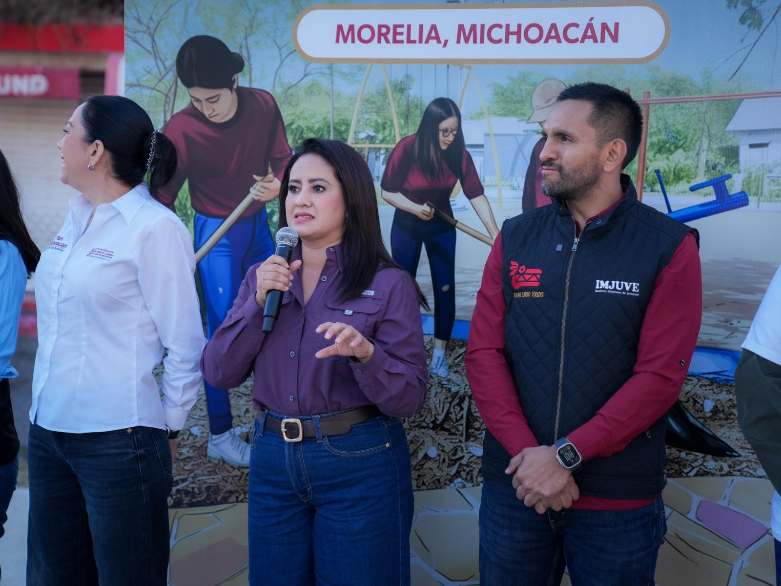La secretaria de Desarrollo Urbano y Movilidad, Gladyz Butanda Macías; el director del Instituto Mexicano de la Juventud (Imjuve), Abraham Carro Toledo, y Mariana Sosa Olmeda, directora general del Instituto de Educación Media Superior y Superior (Iemsysem), establecieron una alianza estratégica para promover la Jornada Nacional de Tequios en espacios deportivos: deporte para todas y todos en Michoacán.