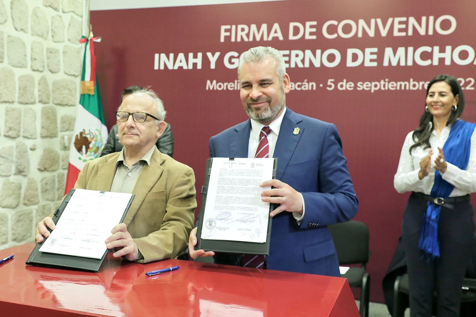 El gobernador, Alfredo Ramírez Bedolla y el director general del Instituto Nacional de Antropología e Historia (INAH), Diego Prieto Hernández, signaron un convenio de colaboración interinstitucional con el objetivo de fortalecer el trabajo coordinado para la preservación del patrimonio material y cultural de Michoacán.