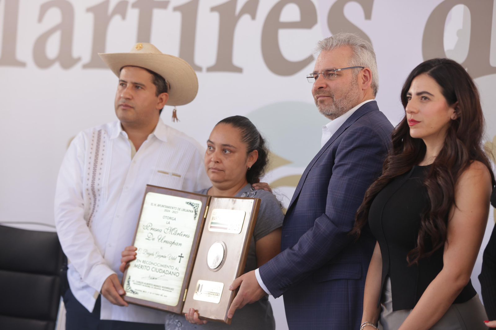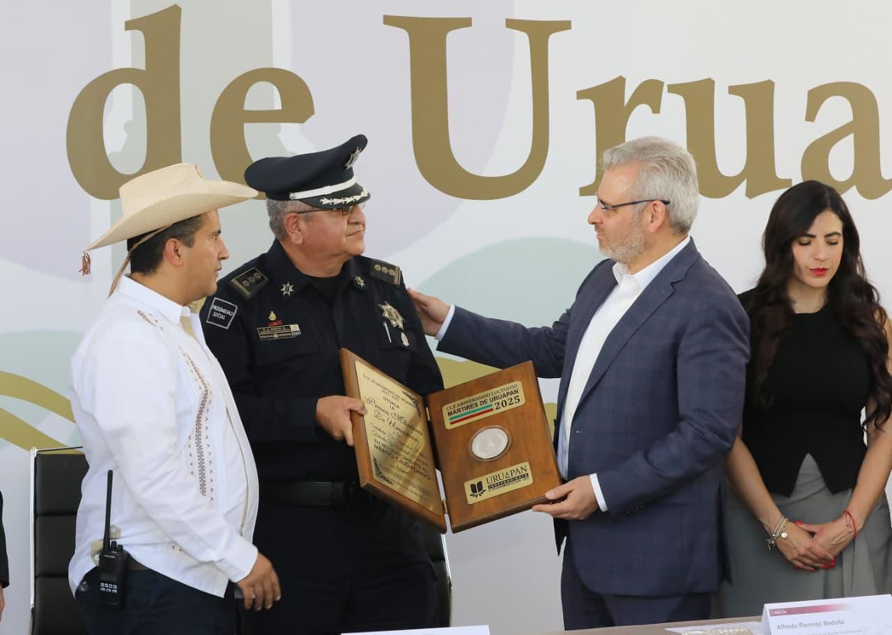 En este marco, el mandatario, acompañado de autoridades de los tres órdenes de gobierno, entregó la Presea Mártires de Uruapan a familiares del policía municipal, Vidal Brígido Guzmán, fallecido en cumplimiento de su deber; a la Secretaría de Seguridad Pública, Tránsito y Vialidad Municipal; y a los agentes locales heridos en cumplimiento de su deber, Daniela Arévalo, Yanuaria Rodríguez y Hugo Caro.