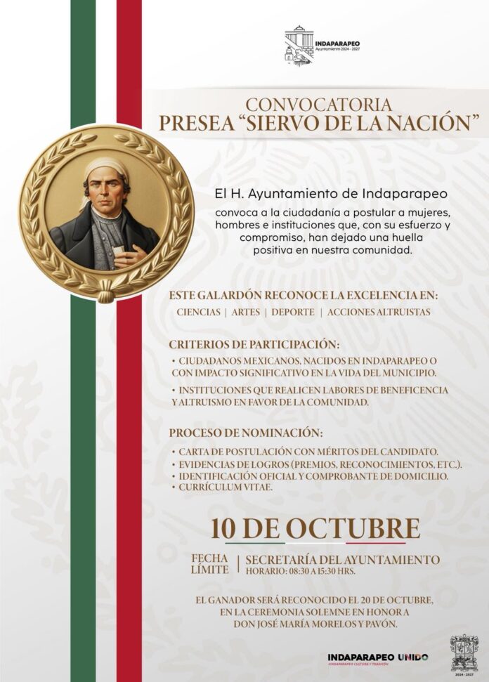 El H. Ayuntamiento de Indaparapeo 2024-2027 publicó la convocatoria para la entrega de la Presea “Siervo de la Nación” 2025, un reconocimiento destinado a aquellos que han dejado una huella positiva en el municipio. Se busca honrar a mujeres, hombres o instituciones que, con su esfuerzo, talento y compromiso, han marcado la diferencia.