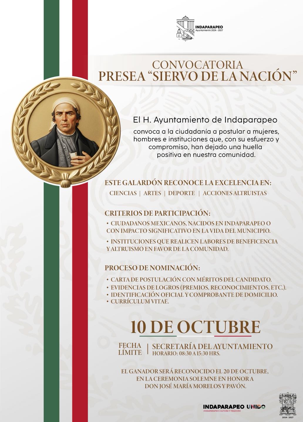 Esta presea busca reconocer a indaparapenses o instituciones destacadas en áreas como las ciencias, las artes, el deporte o por sus acciones altruistas. Si conoces a alguien que con su ejemplo ha inspirado y transformado la comunidad, puedes postularlo en la Secretaría del Ayuntamiento hasta el 10 de octubre, en un horario de 08:30 a 15:30 hrs.
