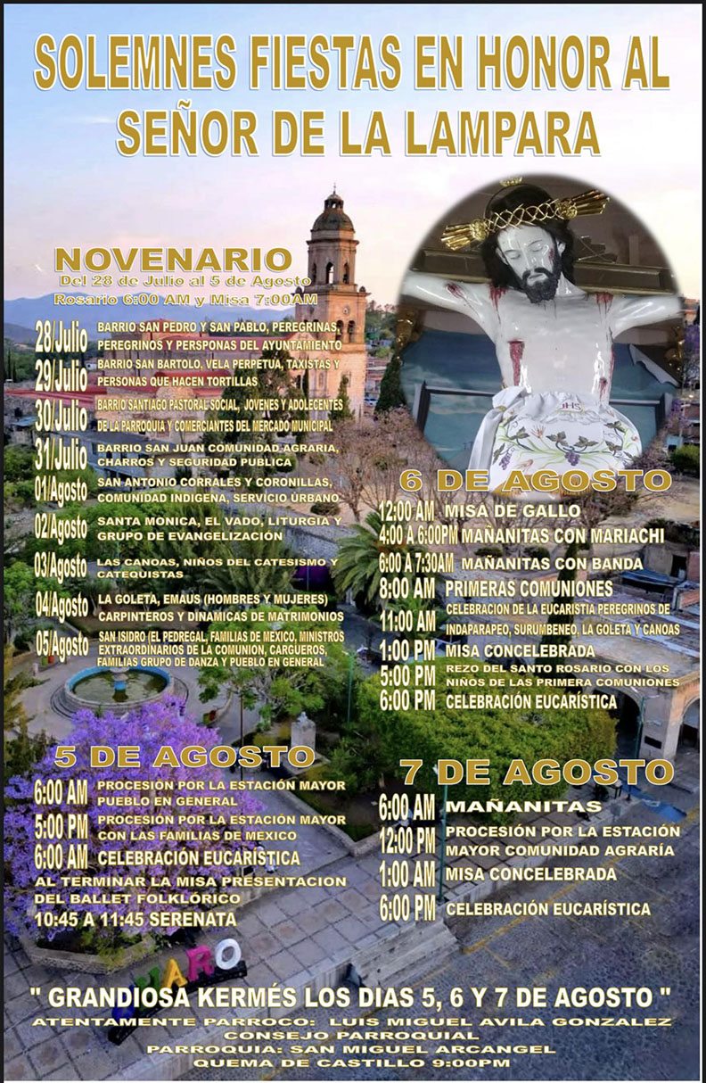 El párroco Luis Miguel Ávila González, así como el Consejo Parroquial, tienen listo el programa de las diferentes actividades litúrgicas que se desarrollarán durante las Solemnes fiestas en honor al Señor de la Lámpara, desde este lunes 28 de julio y hasta el próximo jueves 7 de agosto.