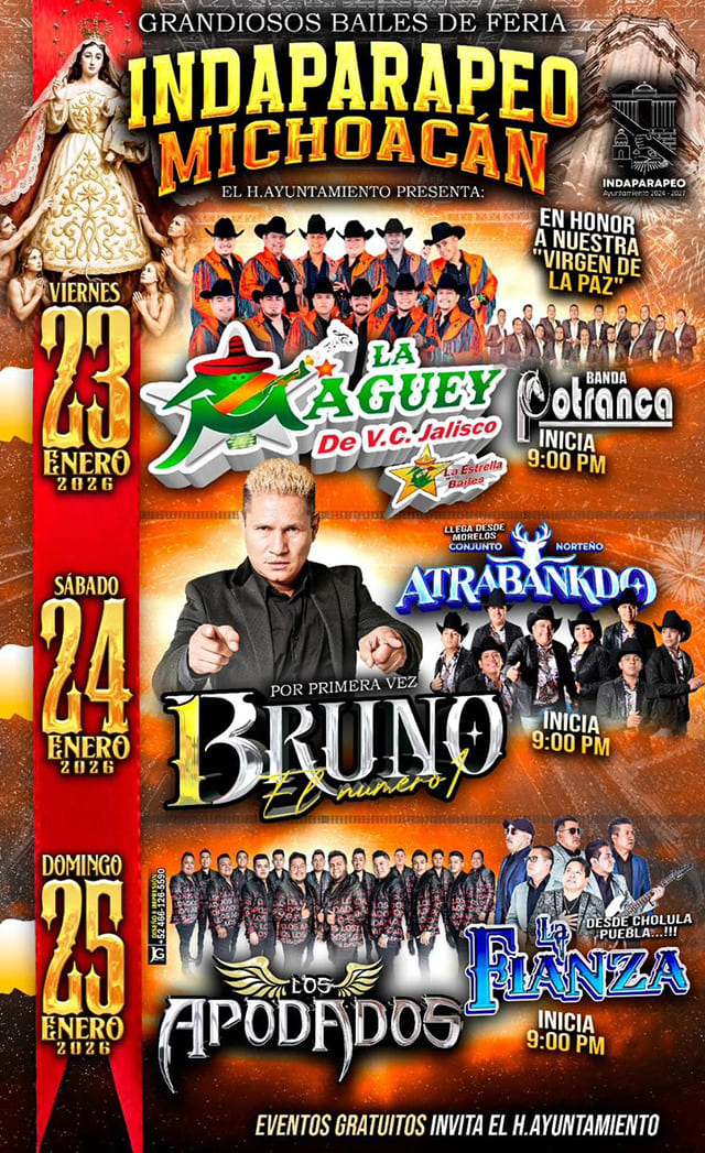 El sábado 24, se presenta por primera vez en el municipio Bruno, el Número 1, luego de telonero conjunto norteño Atrabankado, originario de Morelos. El domingo 25 de enero la presentación estelar será de Los Apodados y previamente los habitantes de Indaparapeo podrán disfrutar, luego de las misas, rosarios y peregrinaciones del día,  del grupo La Fianza, de Cholula, Puebla.