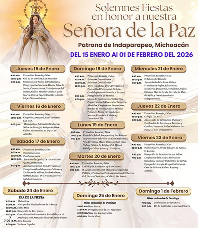 Con procesión, rosario y misa, durante las primeras horas de este jueves 15 de enero se pusieron en marcha las Solemnes Fiestas en honor a Nuestra Señora de la Paz, patrona de Indaparapeo, mismas que se prolongarán en la parroquia hasta el próximo domingo 1 de febrero con diversas actividades religiosas, pero también artísticas y recreativas, al ser la fiesta emblemática del pueblo.
