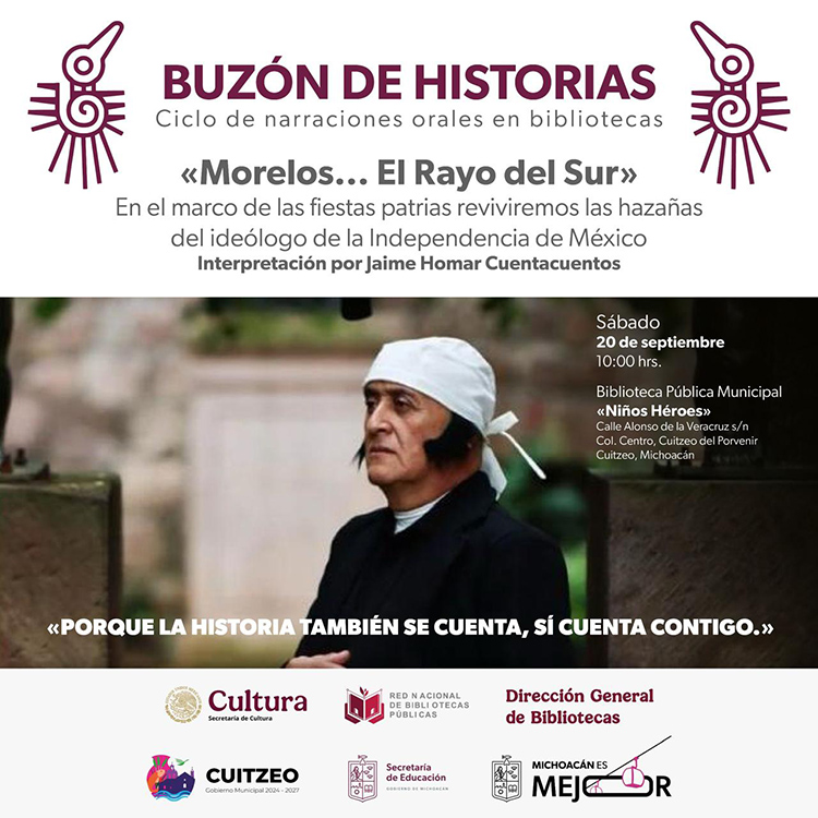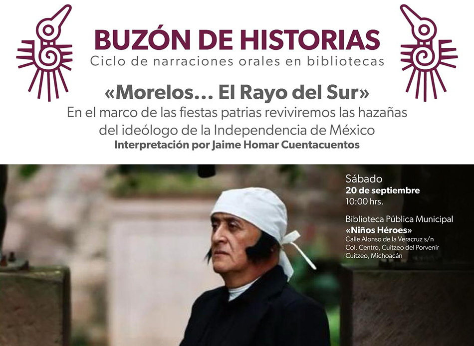 En el marco de las Fiestas Patrias y para conmemorar el CCLX aniversario del natalicio del Siervo de la Nación, Don José María Morelos y Pavón, el gobierno municipal de Cuitzeo que encabeza la Dra. Rosa Elia Milán Pintor invita a niños, jóvenes y adultos a la narración oral “Morelos… El Rayo del Sur”, que presentará este sábado 20 de septiembre el Cuentacuentos Jaime Homar, como parte del programa Buzón de Historias, Ciclo de Narraciones Orales en Bibliotecas.