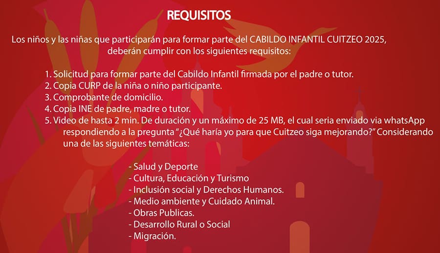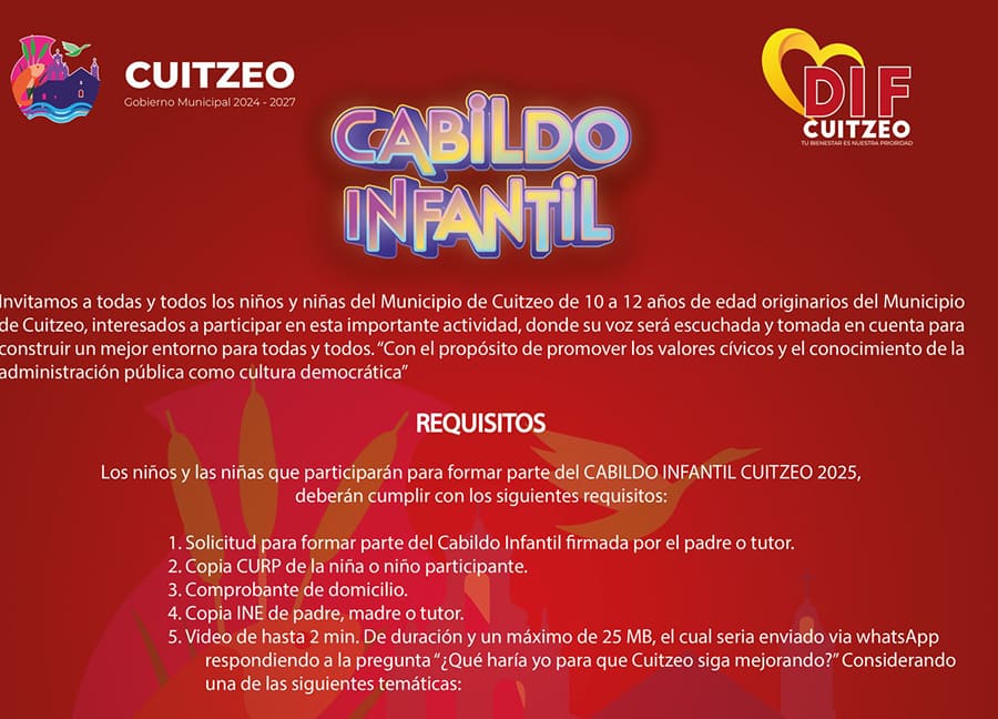 De acuerdo con el Ayuntamiento Municipal de Cuitzeo, los niños que quieran participar en el Cabildo Infantil Cuitzeo 2025 deberán cumplir los siguientes requisitos: solicitud para formar parte del Cabildo Infantil 2025 firmada por el padre o tutor; copia de la CURP del niño participante; Copia INE del padre, madre o tutor; video de hasta 2 minutos de duración y máximo de 25 MB de peso, respondiendo a la pregunta: “Que haría para que Cuitzeo siga mejorando?, considerando las temáticas de: salud y deporte, cultura, educación y turismo, inclusión social y derechos humanos, medio ambiente y cuidado animal, obras públicas, desarrollo rural y social y, migración.