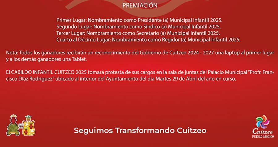 El ganador (a) del primer lugar recibirá nombramiento como Presidente (a) Municipal Infantil 2025; el segundo lugar, síndico; y el tercero, secretario. Del cuarto al décimo se entregarán nombramientos como regidor.