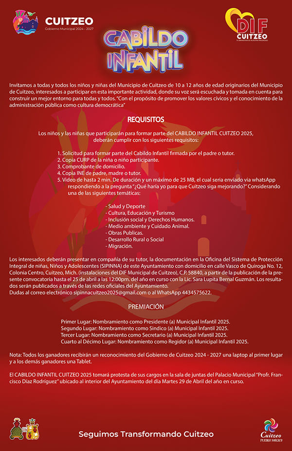 Como una oportunidad única para que sus voces sean escuchadas y para que puedan aportar ideas y propuestas que beneficien a la comunidad, el gobierno municipal de Cuitzeo invita a los niños del municipio a participar en el Cabildo Infantil 2025.