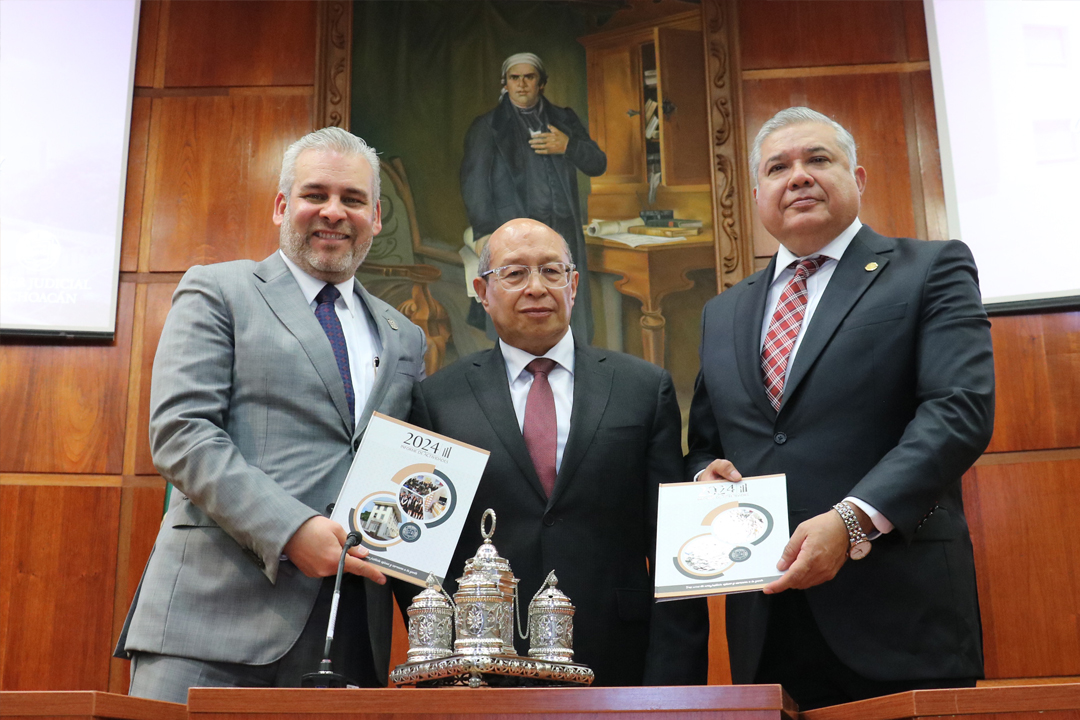 En una sesión extraordinaria solemne de los plenos del Supremo Tribunal de Justicia y del Consejo del Poder Judicial de Michoacán, el magistrado presidente Jorge Reséndiz García presentó el Informe de Actividades 2024, destacando además los avances y logros alcanzados en el periodo 2022-2024.