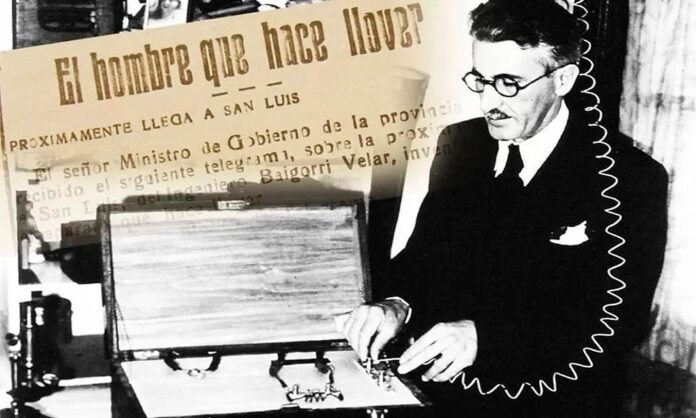 En los años 30 del siglo pasado un ingeniero de nacionalidad argentina inventó, según la prensa de la época, un máquina para hacer llover. La máquina cuyo propósito original era detectar minerales y corrientes de agua subterránea, al activarse, para sorpresa, hacía llover. Se dice que el ingeniero Baigorri Velar llegó a programar lluvias a modo para lugar, día y hora, y lo lograba. Sin embargo, como suele ocurrir con estas noticias extrañas que devienen en leyendas, el inventor oportunamente no legó para la posteridad ni los planos ni un prototipo para replicar tal máquina.