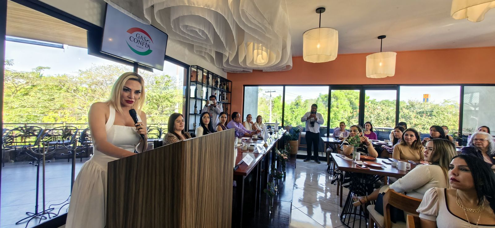 Agradeciendo a la vicepresidenta, Canacintra regional occidente Susana Torres, al Ing. Juan José Meza, presidente Canacintra Colima. Ante la presencia de decenas de mujeres del sector empresarial, titulares de cámaras, presidentas municipales y la representante de la gobernadora a la Secretaría de bienestar, Viridiana Valencia.