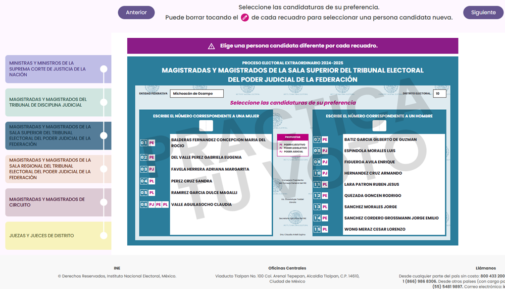 De cara a la Jornada Electoral de la elección del Poder Judicial de la Federación y, por primera vez, el Instituto Nacional Electoral (INE) lanzó una plataforma interactiva: Conóceles, Practica y Ubica, para que la ciudadanía pueda ensayar su voto, así como familiarizarse con las boletas, con lo que se busca reducir el tiempo de emisión del sufragio.