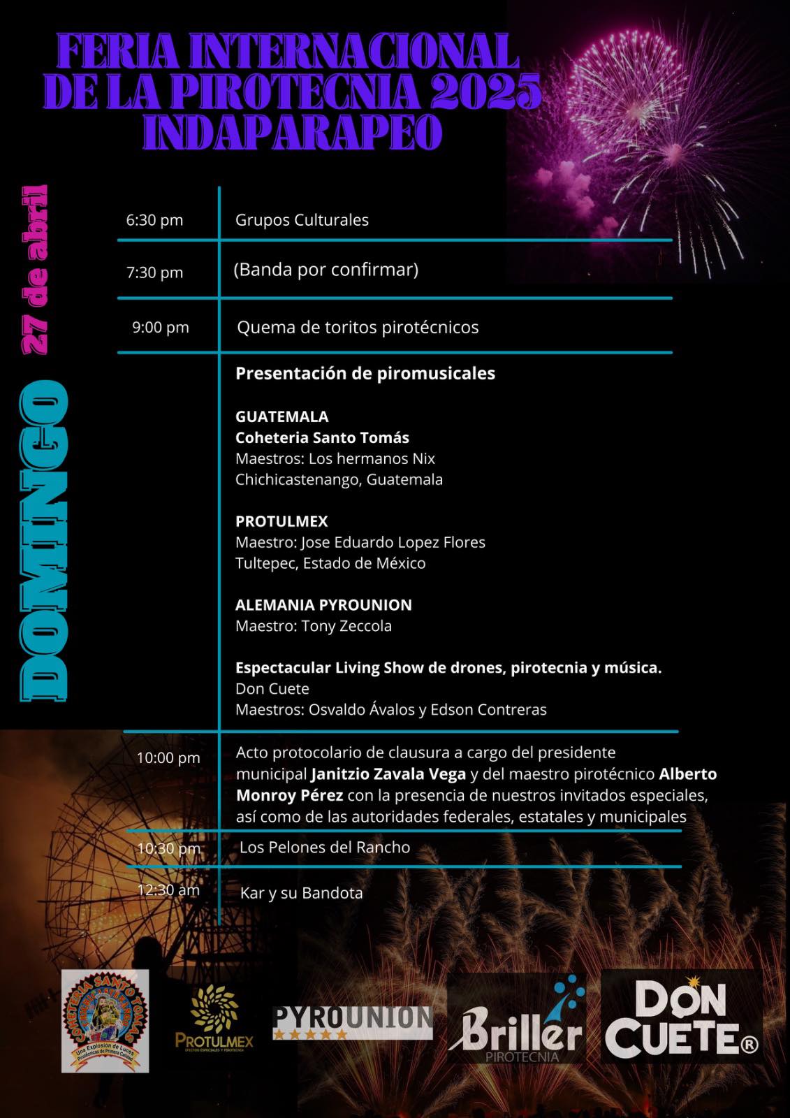 Con drones, piro-musicales y mucha polvera para la quema de toritos, la Feria Internacional de la Pirotecnia de Indaparapeo promete ser más explosiva que nunca, con la participación de agrupaciones musicales, bandas y actividades culturales, programas del 25 al 27 de abril en la Unidad Deportiva de la cabecera municipal.