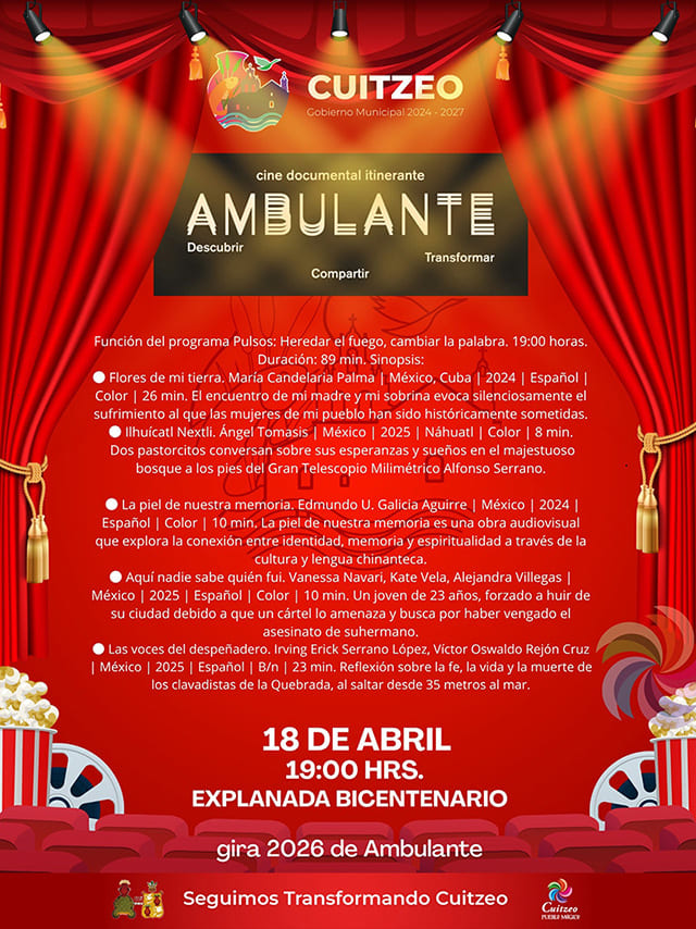 El cine documental de la Gira Ambulante 2026, organización creada hace casi 20 años por los reconocidos actores mexicanos Gael García Bernal y Diego Luna, llega a Cuitzeo este sábado 18 de abril, a partir de las 19:00 horas con la exhibición del programa de cortos Pulsos 2. “Heredar el fuego, cambiar la palabra”, que incluye 5 cortometrajes de directores mexicanos, pertenecientes a la vigésimoprimera gira nacional que comenzó en marzo bajo la temática “Confabular” y que visitará la Ciudad de México, Querétaro, Michoacán (16 al 26 de abril), Morelos y Baja California.