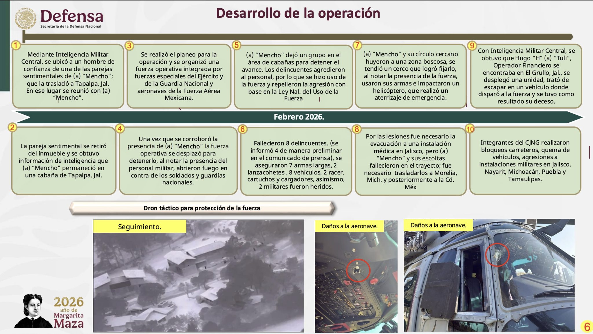 El General Secretario de la Defensa Nacional, Ricardo Trevilla Trejo, detalló que el seguimiento de inteligencia permitió ubicar al delincuente en una zona boscosa de Tapalpa. Tras un violento enfrentamiento que incluyó el uso de lanzacohetes contra aeronaves oficiales, Oseguera Cervantes resultó herido.