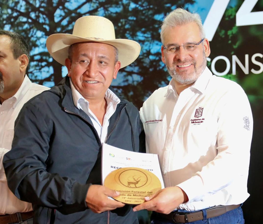 En este marco, el mandatario encabezó la entrega de reconocimientos a Efraín Moreno Salazar, de la comunidad de ejido Rosa Azul, municipio de Senguio; al jefe de brigada de la comunidad de Ucasanastacua, en Tzintzuntzan; y a la coordinadora del Programa Reto Verde, María de los Ángeles González Ramos, por ser ejemplo de responsabilidad, organización y visión a largo plazo en el aprovechamiento sostenible de sus recursos forestales.