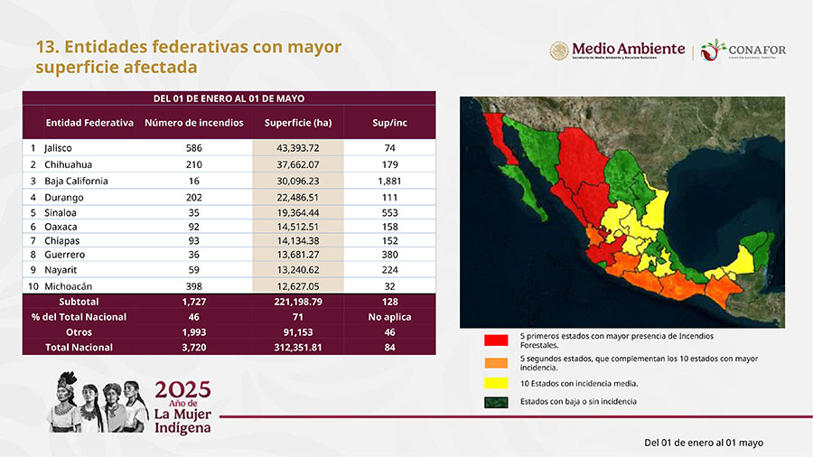 Las entidades federativas con mayor superficie afectada por los incendios son: Jalisco, con 43, 393 hectáreas; Chihuahua, con 37, 662; Baja California, con 30,096 hectáreas y sólo 16 incendios; Durango, con 22, 486; Sinaloa, con 19,364; Oaxaca, con 14, 512; Chiapas, con 14, 134; Guerrero, con 13, 681; Nayarit, con 13, 240; y Michoacán, con 12, 627 hectáreas, dañadas por 398 incendios, que representan estos diez estados el 71% del total nacional de superficie dañada.