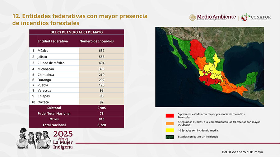 De acuerdo con el mismo documento de la Conafor, en número de incendios, Michoacán se ubica a nivel nacional en la cuarta posición con 398 incendios hasta el primero de mayo del 2025. Las entidades federativas con mayor presencia de incendios son: Estado de México, con 637; Jalisco, con 586; Ciudad de México, con 404; Michoacán, con 398; Chihuahua, con 210 incendios; Durango, con 202; Puebla, con 190; Veracruz, con 93; Chiapas, con 93; y, Oaxaca, con 92 incendios, que representan el 78% del total nacional.