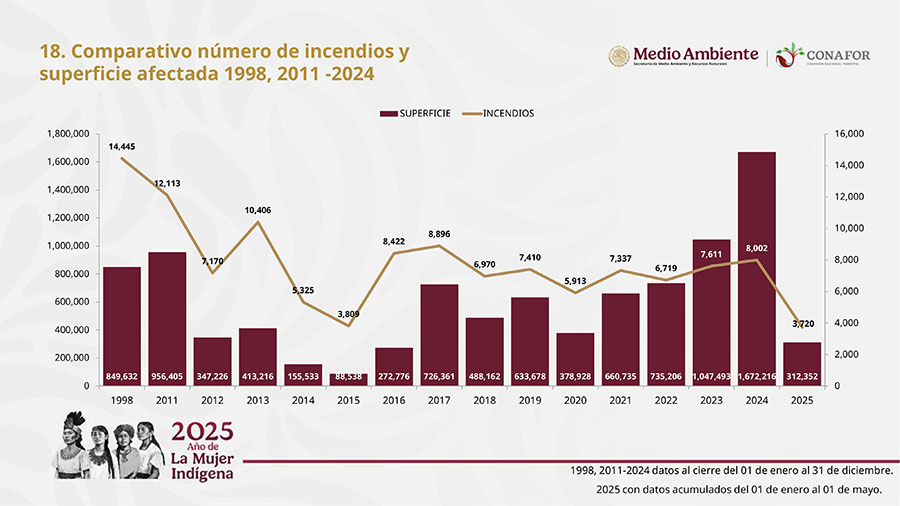 En su último reporte anunciado el pasado 1 de mayo, la Conafor señaló que hasta ese día se habían registrado en México 3,720 incendios forestales en 32 entidades federativas, en una superficie de 312,351.81 hectáreas. De esta superficie, el 95 % correspondió a vegetación en los estratos herbáceo y arbustivo y el 5% a arbóreo.